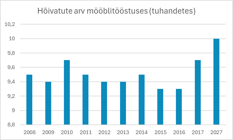 Hõivatute arv on püsinud stabiilselt 9–10 tuhande vahel ning 2027. aasta prognoosi kohaselt kasvab see ligikaudu 10 tuhande inimeseni.