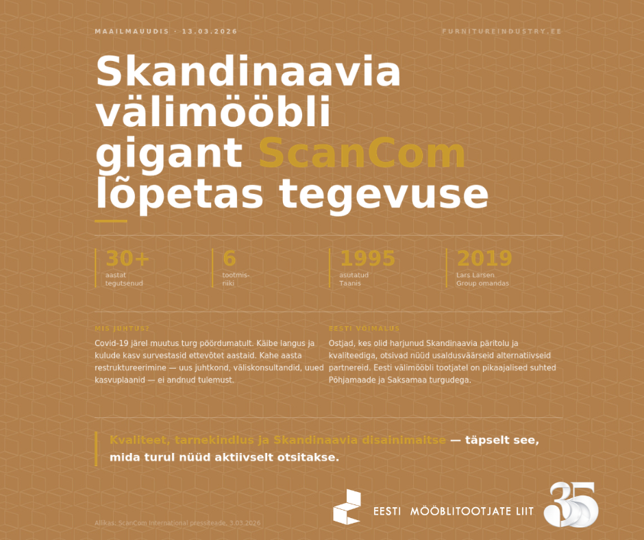 Kopenhaagenis peakorteriga ScanCom International A/S, üks suurimaid B2B välimööbli tootjaid maailmas, teatas märtsi alguses tegevuse lõpetamisest. Ettevõte tegutses üle kolmekümne aasta ning omas tootmist Vietnamis, Brasiilias, Indoneesias, Saksamaal, Suurbritannias ja Hispaanias.